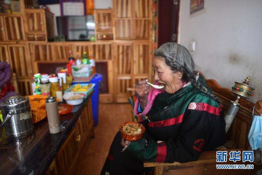 3月14日,來自多彩鄉(xiāng)的85歲老人格沙永瑪在幸福敬老院居室內(nèi)吃午餐。新華社記者 張宏祥 攝