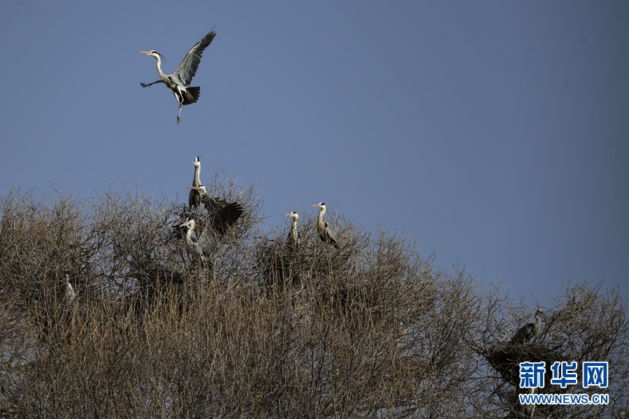 兩只蒼鷺來(lái)回飛舞忙碌建巢。新華網(wǎng) 卡婭梅朵 攝
