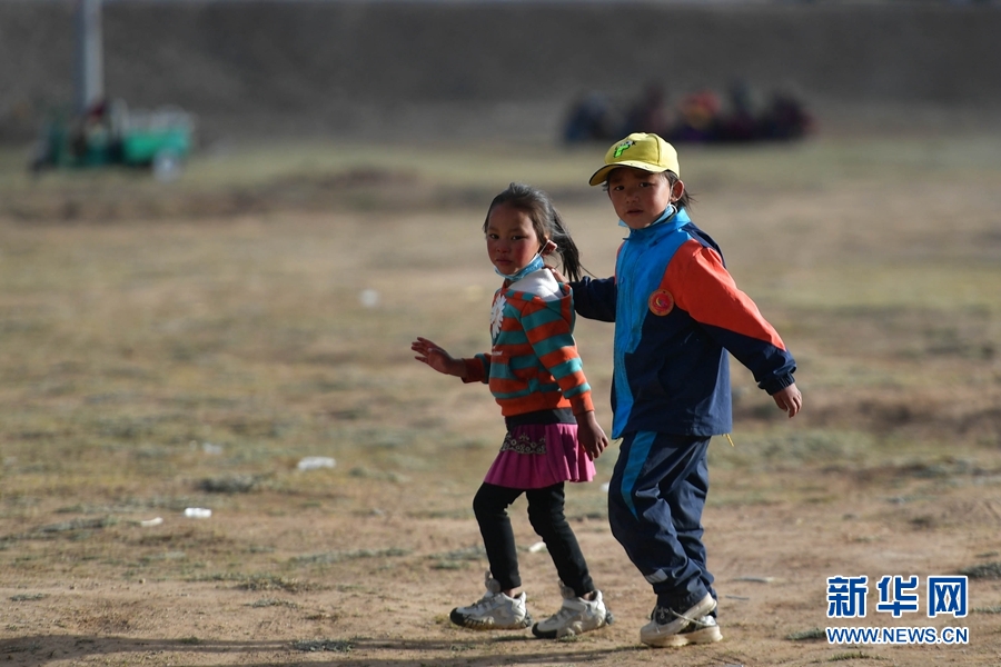 5月26日,兩名小朋友在瑪多縣瑪查理鎮(zhèn)安置點(diǎn)內(nèi)玩耍。
