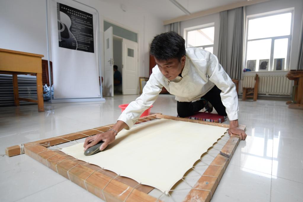 6月17日,在青海民族大學(xué)藝術(shù)學(xué)院,工藝美術(shù)(唐卡)專(zhuān)業(yè)學(xué)生在制作唐卡畫(huà)布。新華社記者 張龍 攝