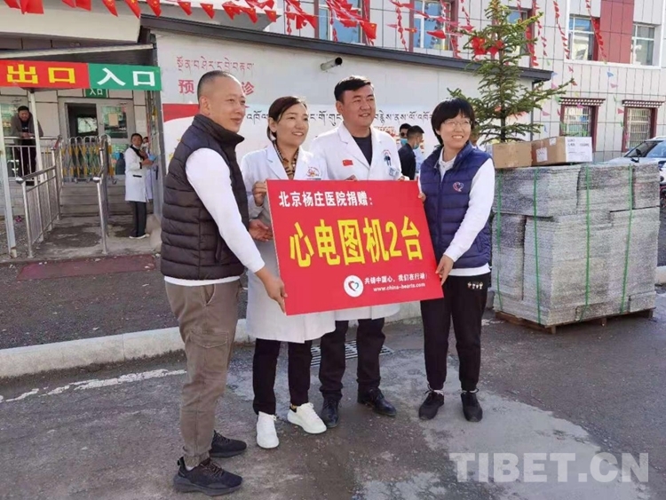 圖為馮亞靜和韓菲代表石景山楊莊醫(yī)院向久治縣醫(yī)院贈(zèng)送兩臺(tái)心電圖機(jī)