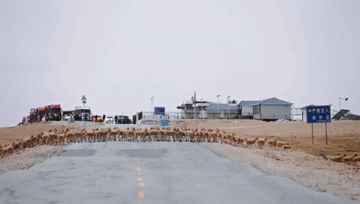 雪山腳下,遠處是貨車停車排隊安靜等待,近處是百余只大小藏羚羊橫穿青藏公路。這是連日來藏羚羊在可可西里安全回遷的場景。