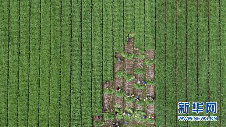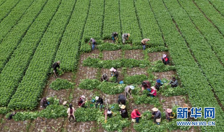 8月13日,在四川省阿壩藏族羌族自治州紅原縣刷經寺鎮(zhèn)加當村,當地群眾在收割高原萵筍(無人機照片)。新華社記者 江宏景 攝