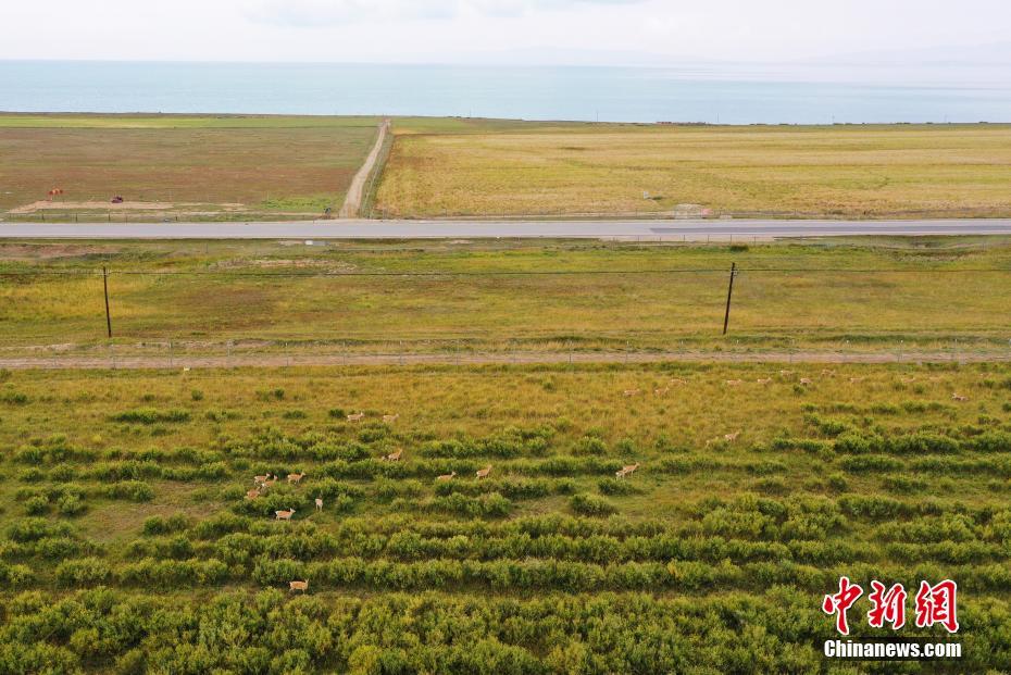 9月27日,在青海省海南藏族自治州共和縣青海湖國家級自然保護(hù)區(qū)南岸保護(hù)站,普氏原羚在草場內(nèi)進(jìn)食。(無人機(jī)照片) 中新社記者 馬銘言 攝