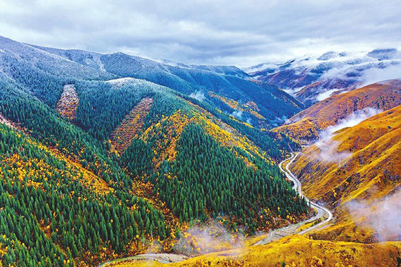 10月27日,阿壩縣以茸安—柯河峽谷為代表的高山峽谷、原始森林生態(tài)系統(tǒng)自然景觀區(qū)內(nèi),彩林紅了,山頂降雪變白了。用旦 攝