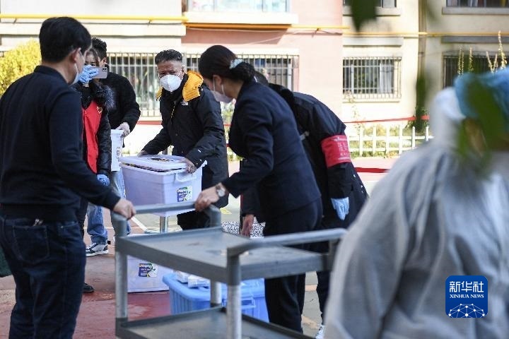 “大家辛苦了,快來拿飯吧,趁熱吃?!薄俺缘暮鹊亩加?,酸奶和牛奶每人一盒?!痹谖鲗幰咔榉揽匾痪€的核酸檢測點,一位皮膚黝黑的藏族漢子和同事抬著箱子,忙前忙后為工作人員和志愿者遞上盒飯??吹酱蠡锒汲陨蠠犸?,臉上露出了爽朗的笑容。