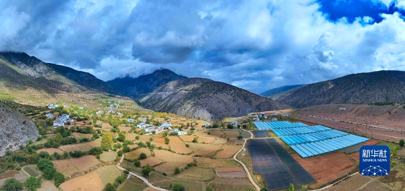 位于郎達(dá)村的得榮縣藥材種植示范基地(無人機(jī)全景照片)。新華社記者 劉坤 攝