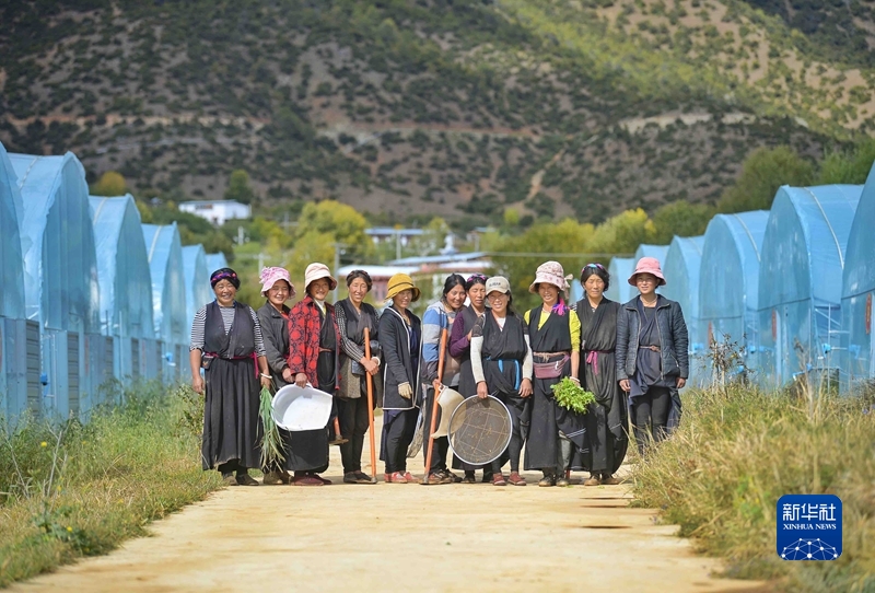 2021年10月22日,郎達(dá)村村民在得榮縣藥材種植示范基地內(nèi)合影。 新華社記者 劉坤 攝