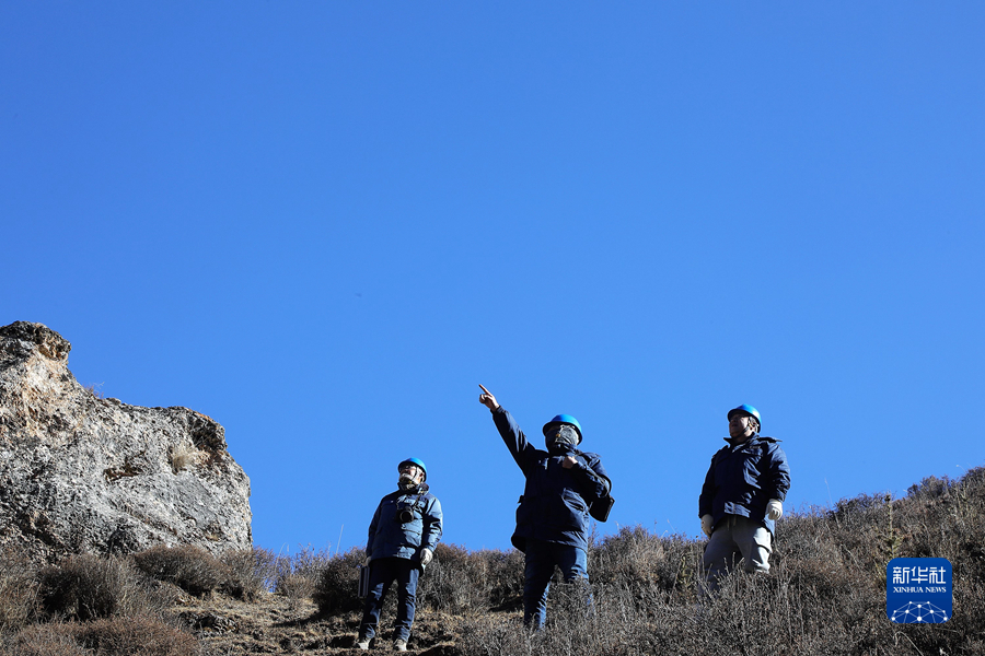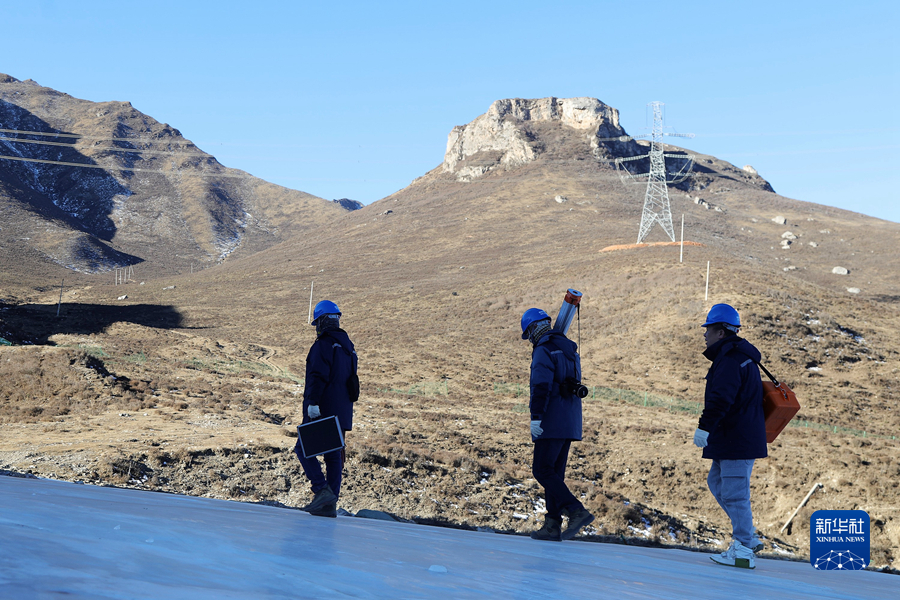 1月19日,國家電網(wǎng)青海省電力公司檢修公司輸電檢修中心專業(yè)班組成員在巡線途中查看線路運(yùn)行情況。新華社記者 趙玉和 攝