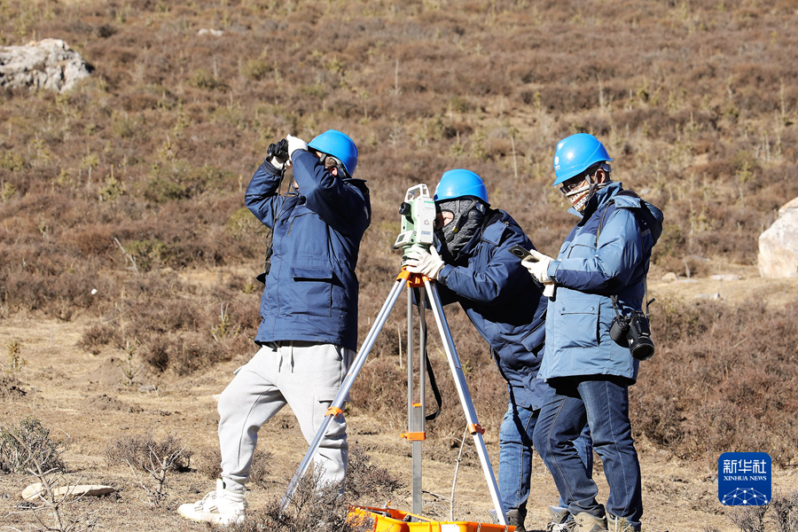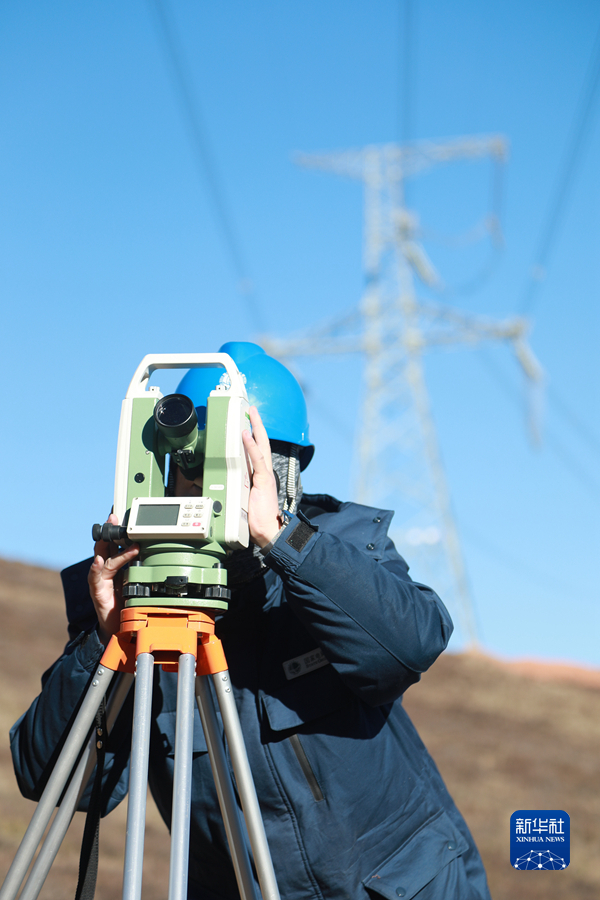 1月19日,國家電網(wǎng)青海省電力公司檢修公司輸電檢修中心專業(yè)班組成員使用經(jīng)緯儀進(jìn)行線路測量工作。新華社記者 趙玉和 攝