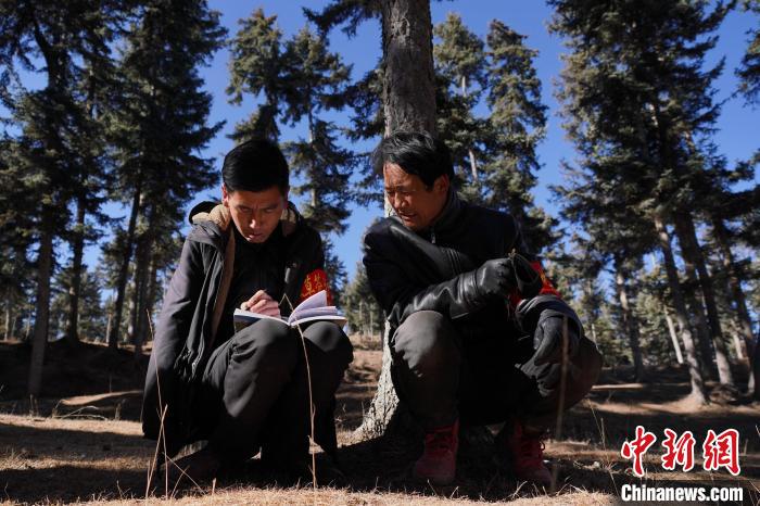 “每天和同事至少要巡護(hù)兩趟。早些年從管護(hù)站到林場只能靠步行,早晨天不亮就出發(fā)?,F(xiàn)在,每次巡邏都能和會騎摩托車的同事一起,方便多了?!鄙=芗友刂暄训男÷?,往林場深處走去,巡護(hù)中,看見一棵樹體上有大片樹皮開裂,桑杰加立即上前檢查是否有凍害、蟲口等。