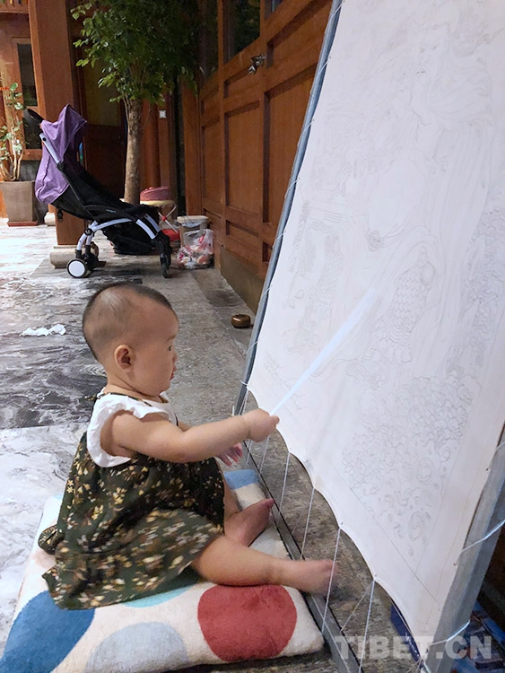 仁青多杰自己也有兩個女兒,大女兒已經(jīng)快五歲了,受家庭環(huán)境熏陶,從會走路時起,就喜歡拿毛筆,也非常喜歡畫畫。仁青多杰和父親每天都在畫畫,有一次在北京,仁青多杰的一幅唐卡快要完成了,女兒趁著中午大人們吃飯的間歇,跑出去拿著毛筆和顏料自己畫。那幅畫仁青多杰一直保留在北京,準(zhǔn)備等女兒長大后送給她。