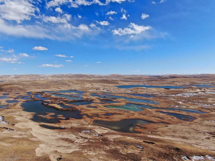 在青海省果洛藏族自治州瑪多縣境內(nèi)拍攝的一處濕地(無人機(jī)照片)。新華社記者 張龍 攝