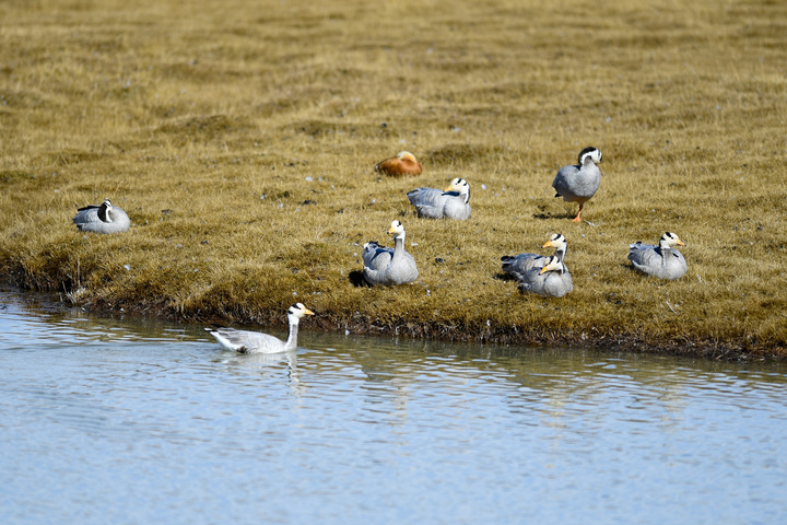 在三江源國家公園黃河源園區(qū)內(nèi)拍攝的一群斑頭雁。新華社記者 李占軼 攝