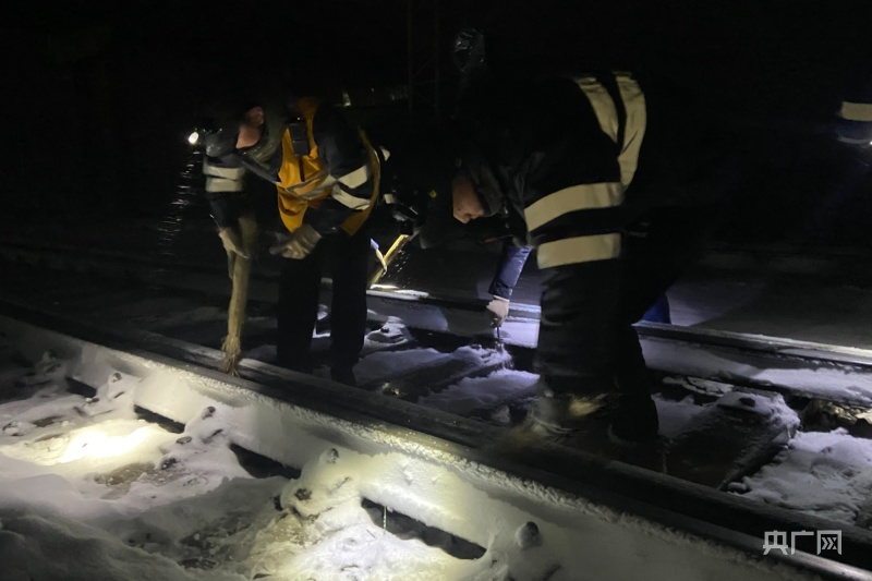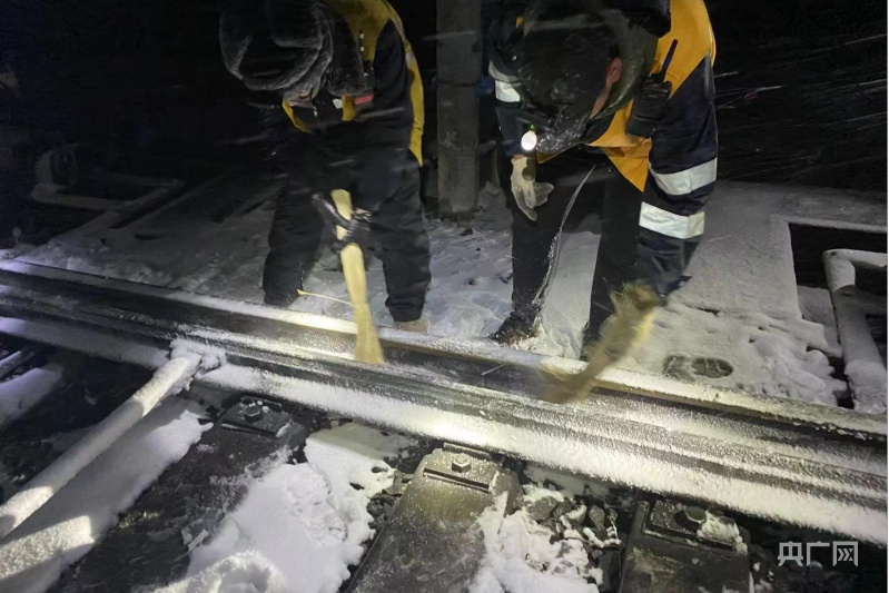 深夜風雪中,清掃道岔滑床板。央廣網發(fā) 余國棟 攝