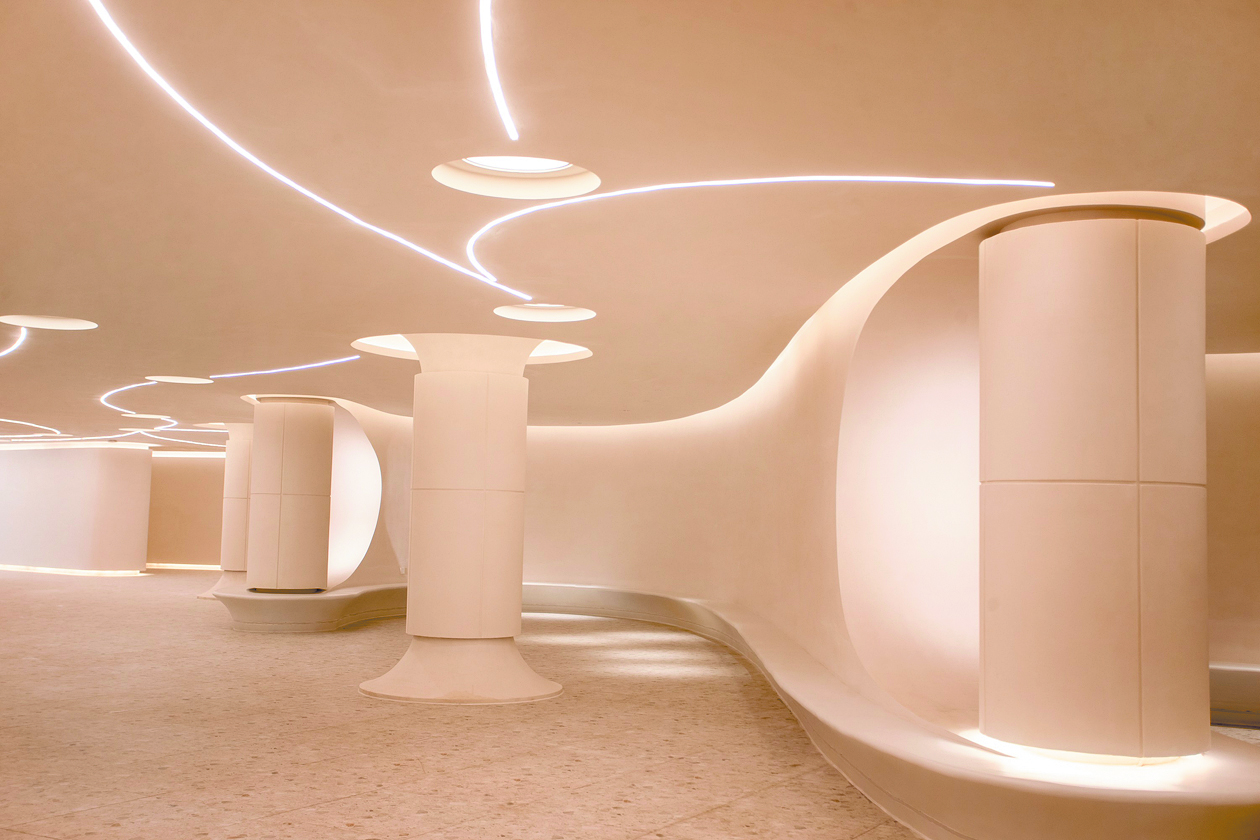 “看見九寨”大樓內(nèi)的10余個空間里,設(shè)計團隊用不同的色彩和科技表現(xiàn)手法表達出不同的舒緩風格,治愈人心?!蔼氉孕褋怼彼囆g(shù)館運用弧形和曲線,將空間切割出曼妙的身形,輕盈靈動,淺黃柔色的燈光彌漫著溫柔氣息;以白色調(diào)為主的“九寨時光”圖書館,能讓人從浮躁中快速安靜下來。