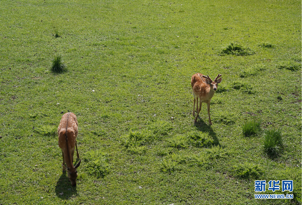 祁連鹿場(chǎng),兩只梅花鹿正在愜意地吃草、漫步。新華網(wǎng) 卡婭梅朵 攝
