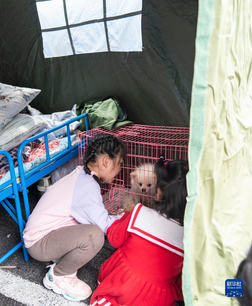 9月6日,在四川甘孜州瀘定縣磨西鎮(zhèn)海螺溝廣場受災(zāi)群眾臨時安置點(diǎn),兒童與從家中帶過來的小狗玩耍。新華社記者 才揚(yáng) 攝