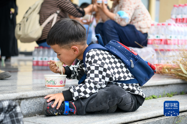 9月6日,在位于石棉縣王崗坪鄉(xiāng)挖角村村委會的安置點,一名小朋友在吃午飯。新華社記者 胥冰潔 攝