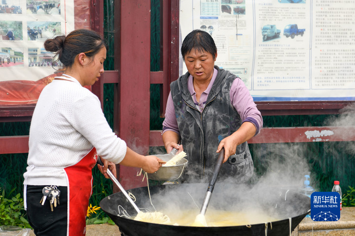 9月6日,在位于石棉縣王崗坪鄉(xiāng)挖角村村委會的安置點,村民在準備午飯。新華社記者 胥冰潔 攝