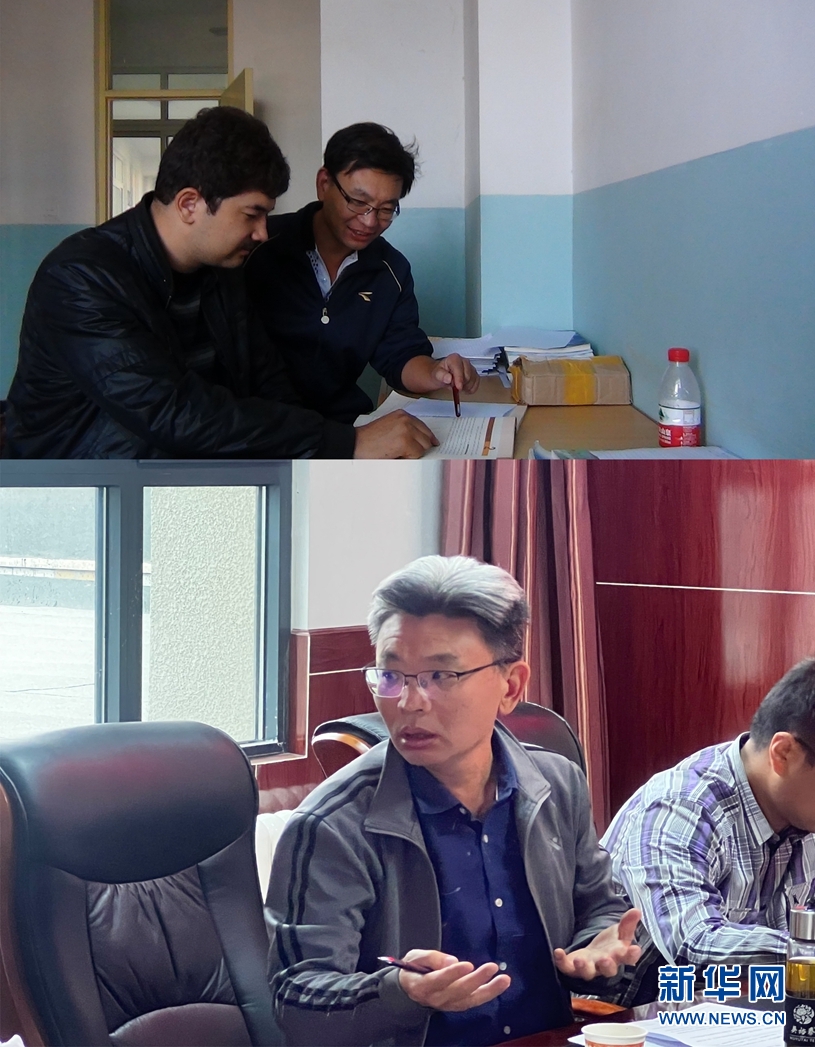 這是一張拼版照片:上圖為2014年6月23日,趙焱(右)與和田縣第二中學(xué)青年教師一起交流(新華網(wǎng)發(fā) 受訪對(duì)象供圖);下圖為2022年3月31日,趙焱(左)在玉樹州教育局參加玉樹州高三備考會(huì)。(新華網(wǎng)發(fā) 受訪對(duì)象供圖)