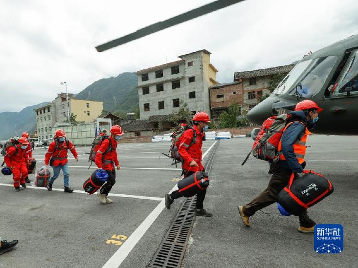 9月7日,在四川省甘孜州瀘定縣磨西鎮(zhèn),四川省冶勘設計集團有限公司的6名調(diào)查隊員攜帶裝備搭乘直升機前往海螺溝景區(qū)開展地質(zhì)災害應急排查工作。新華社記者 沈伯韓 攝