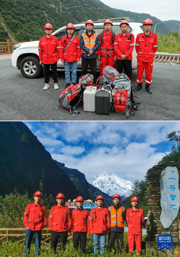 這是一張拼版照片,上圖為:9月7日,四川省冶勘設計集團有限公司的6名調(diào)查隊員在搭乘直升機去往海螺溝前拍攝的合影(新華社記者沈伯韓攝);下圖為:9月10日,6名調(diào)查隊員在海螺溝景區(qū)一號營地拍攝的合影(四川省冶勘設計集團有限公司供圖)。新華社發(fā)