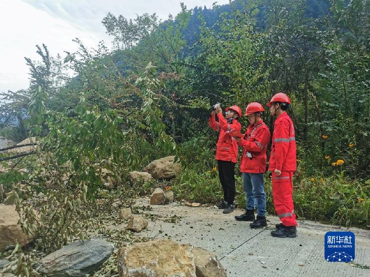 9月8日,王繼剛在幫清理道路落石的隊員觀察山上落石。新華社記者 胥冰潔 攝