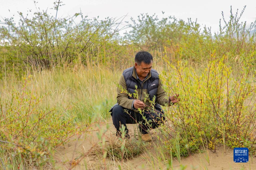牧民卓瑪加布在黃河瑪曲段干流沿岸一處沙丘上查看他參與種植的灌木生長情況(9月16日攝)。新華社記者 郎兵兵 攝