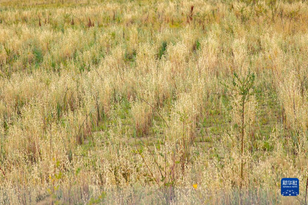 這是黃河瑪曲段干流沿岸一處阻沙林帶建設區(qū)域的草方格沙障內的植被(9月16日攝)。新華社記者 郎兵兵 攝