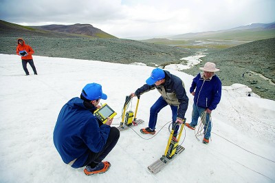 在格拉丹東雪山,科考隊員使用地質雷達探測冰川。