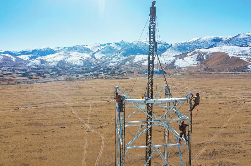 2022年10月23日 技術人員在百米高的子午工程二期定標塔上調(diào)試天線。