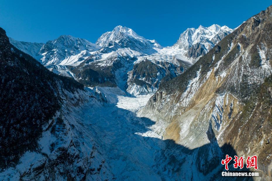 1月9日,中新網(wǎng)記者走進四川瀘定海螺溝景區(qū)核心區(qū),航拍經歷了2022年“9.5”瀘定6.8級地震的貢嘎山海螺溝冰川冰瀑布,雄偉壯觀依舊。