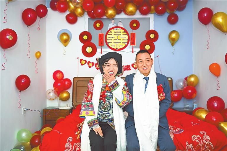 新康村村民本永龍在新家迎娶新娘。