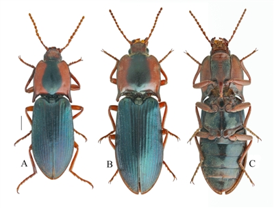 2022年6月17日,綿陽師范學院團隊來到四川省阿壩藏族羌族自治州黑水縣,開展草原有害生物普查工作。當天下午6點過,他們到達了黑水縣,在蘆花鎮(zhèn)四美村的一條土路旁,一只長相新奇的甲蟲引起了許浩的注意?!八l(fā)現后趕緊叫住我,甲蟲呈現金屬藍色光澤,在其前胸背板的兩側,都有紅色斑紋,長得特別好看。”邱鷺說,“當時初步判斷是一個金叩甲的物種,但以前從來沒見過?!?/p>
