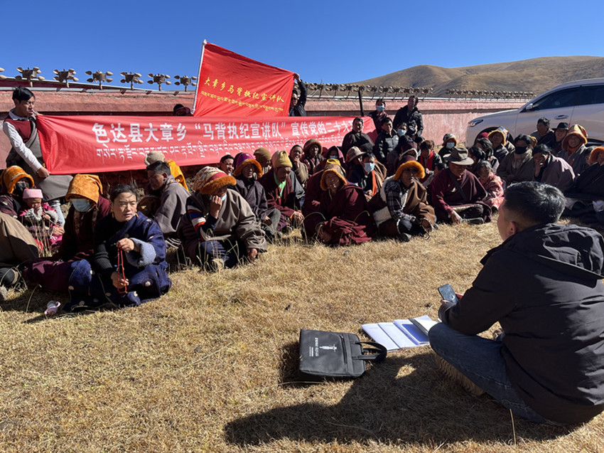 “黨的二十大報(bào)告提出,增進(jìn)民生福祉,提高人民生活品質(zhì)……”“中國(guó)共產(chǎn)黨第二十屆中央紀(jì)律檢查委員會(huì)第二次全體會(huì)議要求,堅(jiān)決整治各種損害群眾利益的腐敗問(wèn)題……”在大章鄉(xiāng)青塔貢瑪壩子上,鄉(xiāng)紀(jì)委書記洛絨洛伍帶領(lǐng)的宣講隊(duì),與確倉(cāng)村和嘎志瑪一村、二村的150余名農(nóng)牧民群眾圍坐在一起。從黨的各項(xiàng)惠民利民富民政策的落實(shí),到干部背包入戶結(jié)對(duì)幫扶的實(shí)例,從村子水電路等基礎(chǔ)設(shè)施的變化,再到人居環(huán)境改善、便捷就醫(yī)入學(xué)給大家?guī)?lái)的實(shí)惠……洪亮的藏漢雙語(yǔ)聲中,隊(duì)員們接力展開(kāi)宣講。