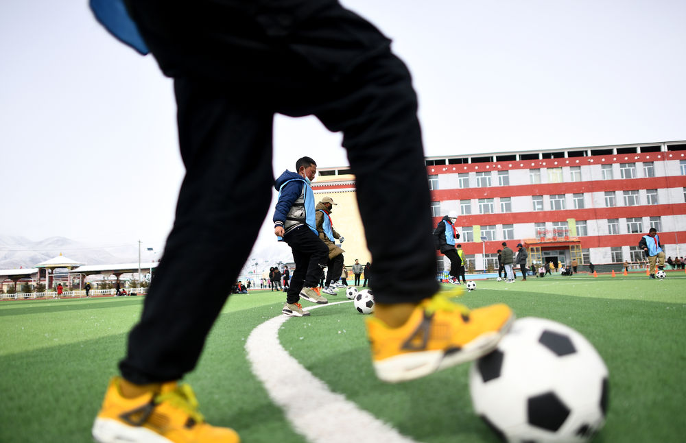 3月1日,在玉樹州治多縣,城南幼兒園小朋友桑周尼瑪(前)在練習射門。新華社記者 張宏祥 攝
