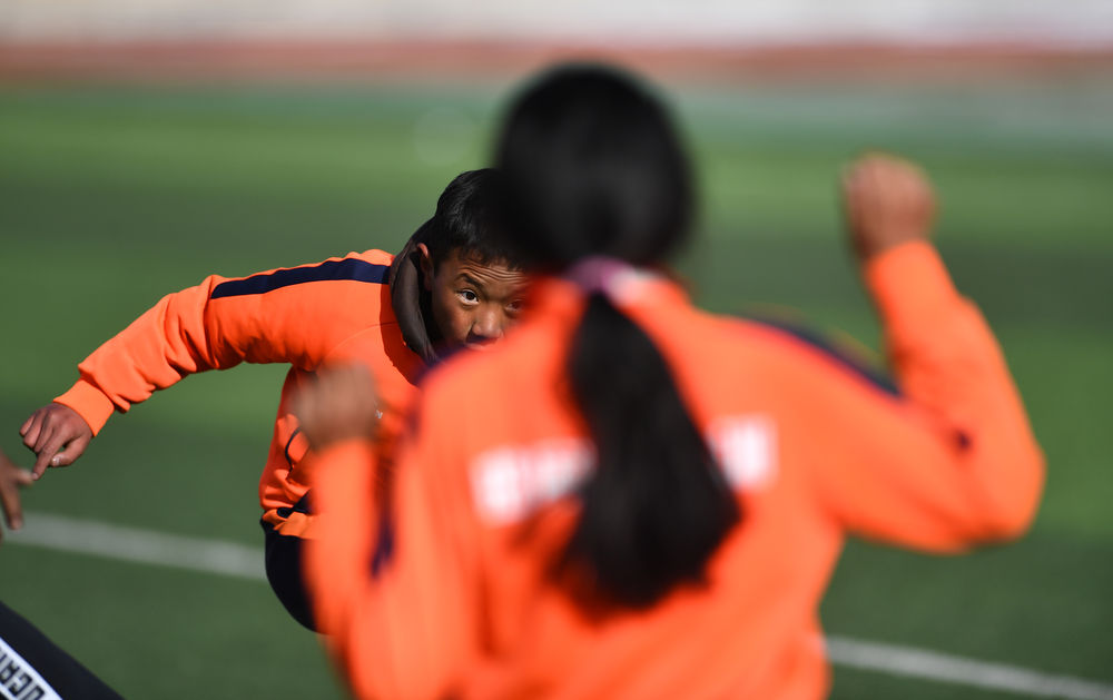 3月1日,在玉樹州曲麻萊縣第一完全小學,曲麻萊青訓隊球員白瑪加(左二)在訓練課上。新華社記者 張宏祥 攝