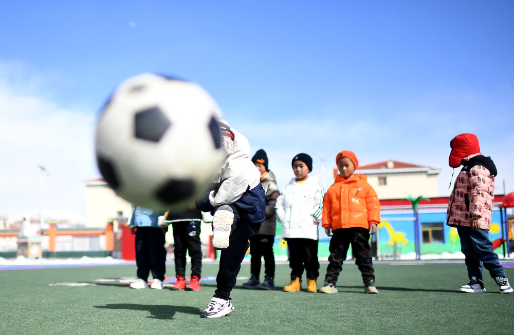 3月1日,在玉樹州治多縣,城南幼兒園小朋友旦增然桑(左一)在練習射門。新華社記者 張宏祥 攝