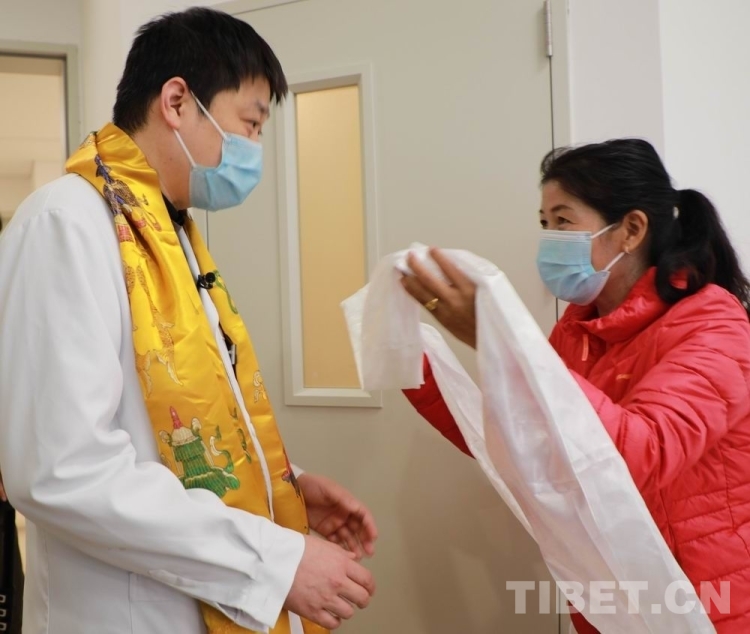 圖為來(lái)自青海省果洛藏族自治州的唇腭裂患兒家屬為中國(guó)醫(yī)學(xué)科學(xué)院整形外科醫(yī)院唇腭裂整形科主任宋濤獻(xiàn)上哈達(dá) 攝影:劉莉