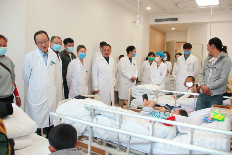 圖為中國醫(yī)學(xué)科學(xué)院整形外科醫(yī)院院長蔣海越教授(左六),院黨委書記王寶璽教授(左二)等院領(lǐng)導(dǎo)班子成員來到病房看望來自青海果洛的患兒及患兒家屬攝影:劉莉
