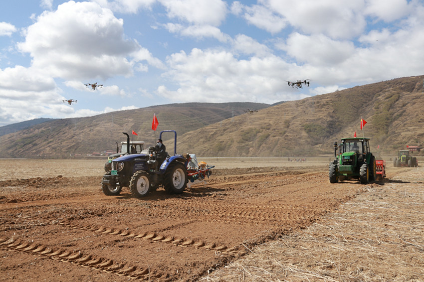 隨著一聲擲地有聲的“開耕……”,十余輛大型農(nóng)機(jī)具緩緩入地,現(xiàn)場(chǎng)為大家展示了青稞全程機(jī)械化作業(yè)。20臺(tái)免耕播種機(jī)、約翰迪爾1354輪式拖拉機(jī)等機(jī)具在農(nóng)機(jī)手熟練操控下,旋耕、播種、覆土、鎮(zhèn)壓一次完成,無人機(jī)飛舞在天空,噴灑著農(nóng)藥,一幅現(xiàn)代版鐵?!按焊备?jìng)技圖躍入眼簾,在場(chǎng)人員紛紛掏出手機(jī)、相機(jī)拍攝記錄下這富有“科技感”的畫面。