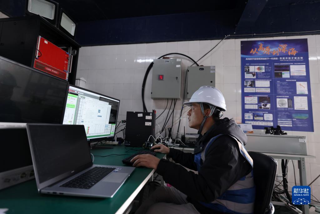 4月22日,工作人員在高海拔宇宙線觀測(cè)站觀測(cè)基地水切倫科夫探測(cè)器陣列處理實(shí)驗(yàn)數(shù)據(jù)。新華社記者 金立旺 攝