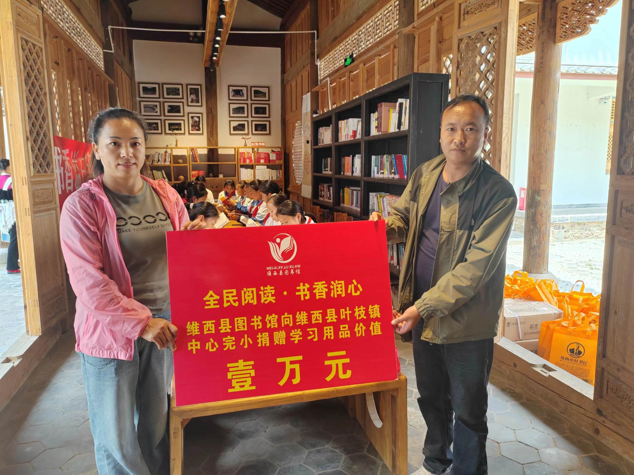 當天,還在葉枝鎮(zhèn)鄉(xiāng)愁書院開展了讀書分享活動,維西縣圖書館現(xiàn)場向葉枝鎮(zhèn)中心完小捐贈了價值10000元的學(xué)習用品。