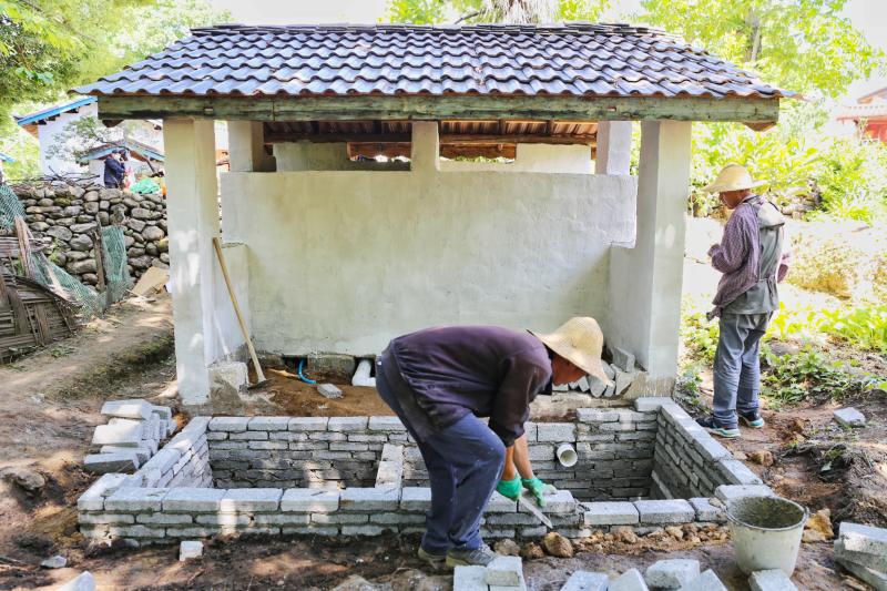 工人正在金江鎮(zhèn)吾竹村進行農村三格式戶廁建設