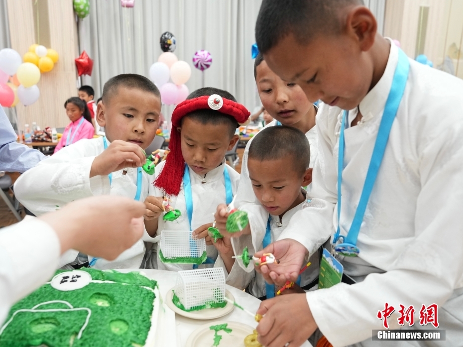 圖為藏族孩子們分享蛋糕。中新社記者 崔楠 攝