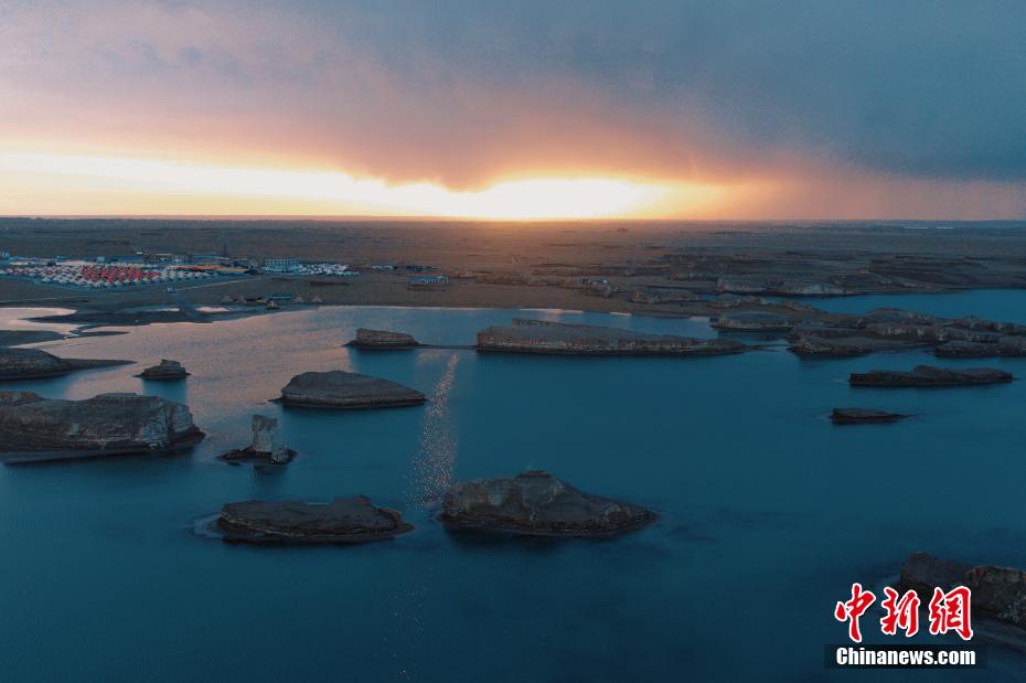 6月24日,清晨的降雨過(guò)后,青海省海西蒙古族藏族自治州大柴旦烏素特(水上)雅丹天空澄碧,纖云不染,太陽(yáng)緩緩上升,給天邊鑲嵌了一條金邊,與烏素特(水上)雅丹遙相輝映,風(fēng)光旖旎。