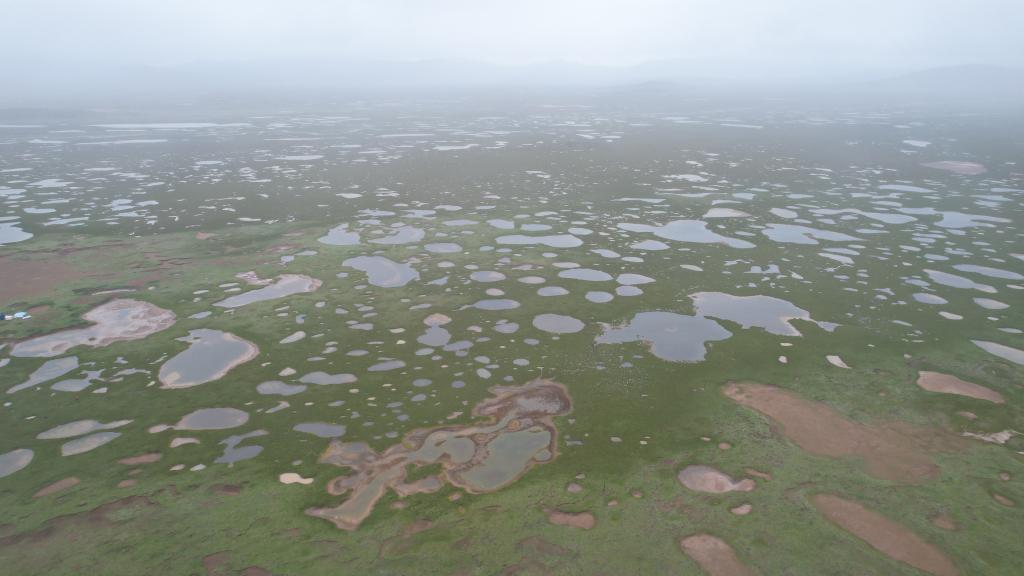 記者在距離當(dāng)曲源頭不到10公里處升起無(wú)人機(jī)看到,沼澤濕地中,大大小小的沼澤湖泊星羅棋布。