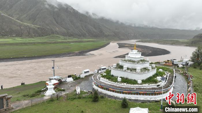 連日來雨水持續(xù),清晨的通天河挾卷泥沙,波濤涌動(dòng),河中央的月牙形沙洲被沖刷出柔美的弧線。四周群山青翠、霧靄繚繞,白塔靜靜佇立在古渡口邊,似水墨畫頗具詩意。石階延伸處,牧人緩緩走過轉(zhuǎn)經(jīng)筒,遠(yuǎn)處村莊籠罩在一片朦朧中。
