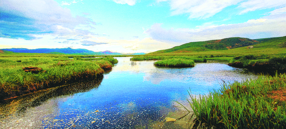 藍(lán)天白云下的隆寶灘國(guó)際重要濕地寧靜而美麗。